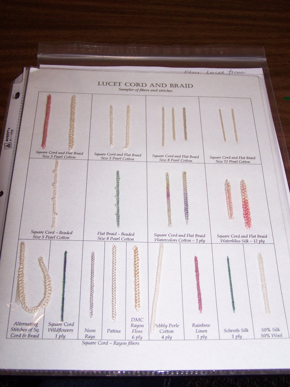 .. and here is a small sample of different types of cording you can make with the lucet (beaded, flat, square, multi-colored - you name it!):